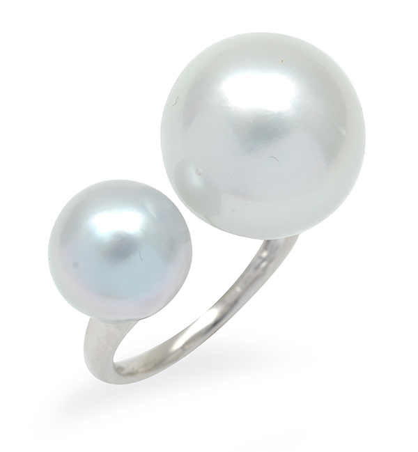 Featuring a round pearl of silver and white hues measuring 14.80mm and a smaller pearl of silver and grey hues measuring 10.00mm, mounted in 18ct white gold, ring size M.