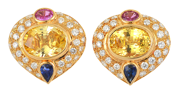Each earring horizontally set with an oval cut yellow sapphire of 7.58cts, flanked by an oval cut pink sapphire and a pear cut blue sapphire, having pave set diamond detail throughout, mounted in 18ct rose gold.