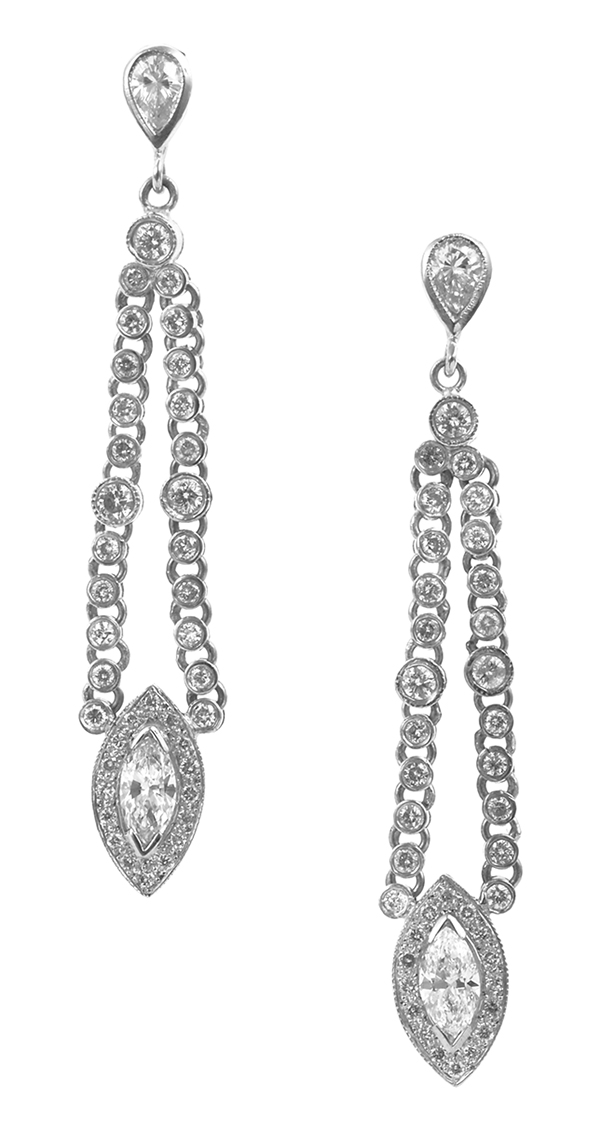Each set with a cluster featuring a marquise cut diamond of 0.38cts, suspended from a double row of round brilliant cut diamonds and terminating with a pear cut diamond of 0.20cts, mounted in 18ct white gold.