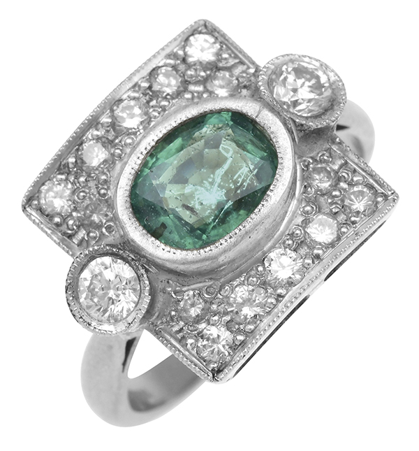AN ART DECO STYLE EMERALD AND DIAMOND PLAQUE RING