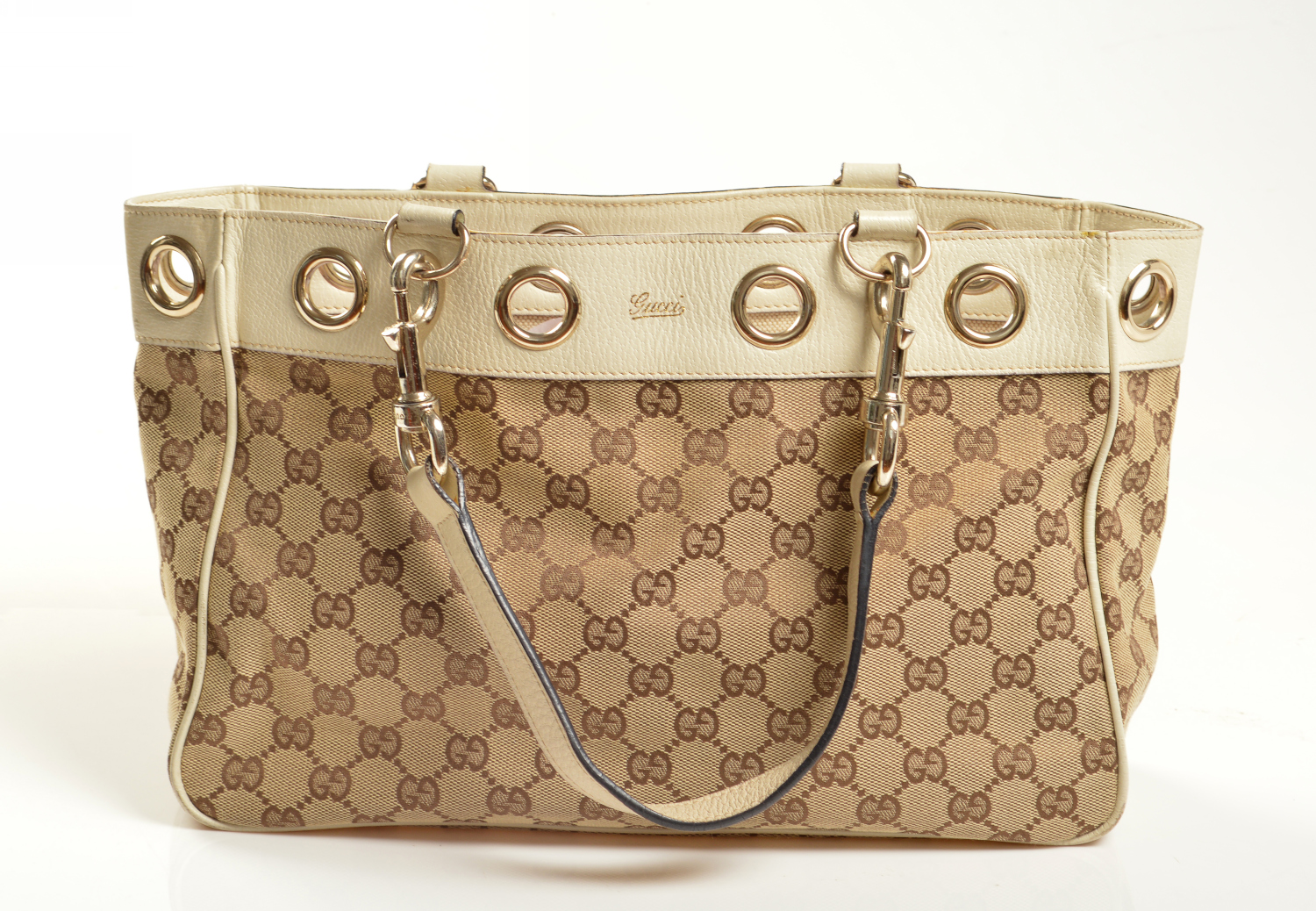 Styled in signature canvas with cream leather trim and handles, and gold metal hardware, 162879-9771, 32 x 21 x 10cm.