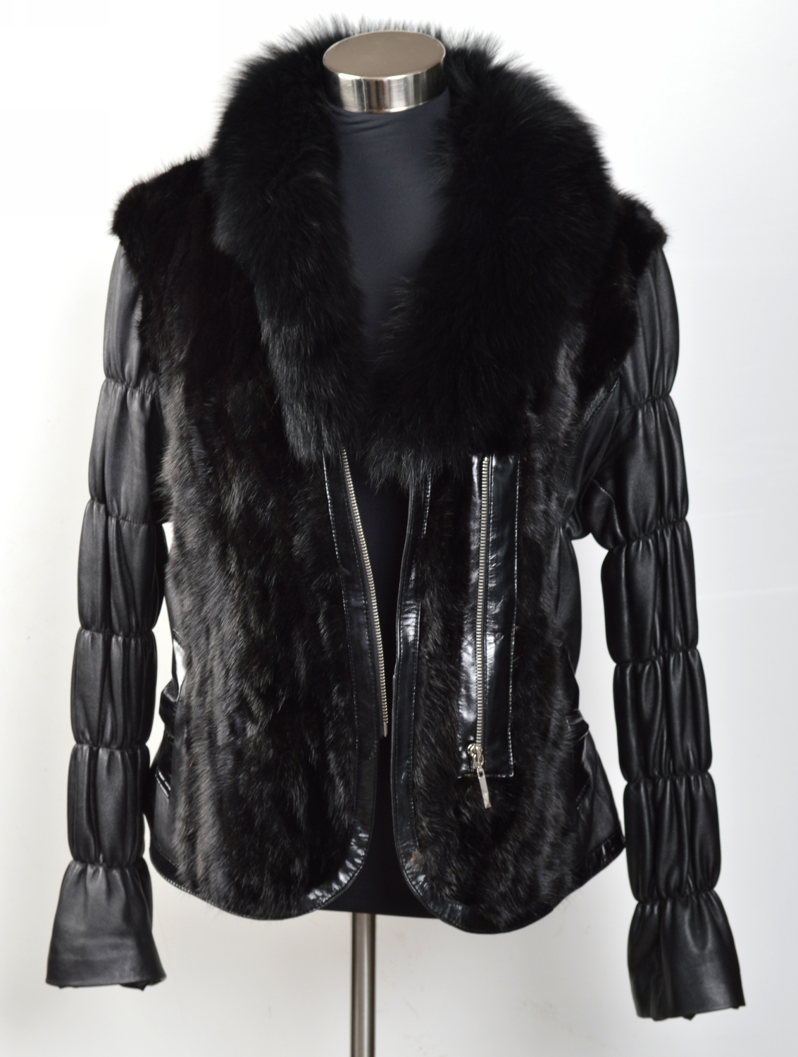 The black mink and leather jacket, with dyed black shadow fox collar, and silver metal hardware, labelled size L, centre back length 56cm.