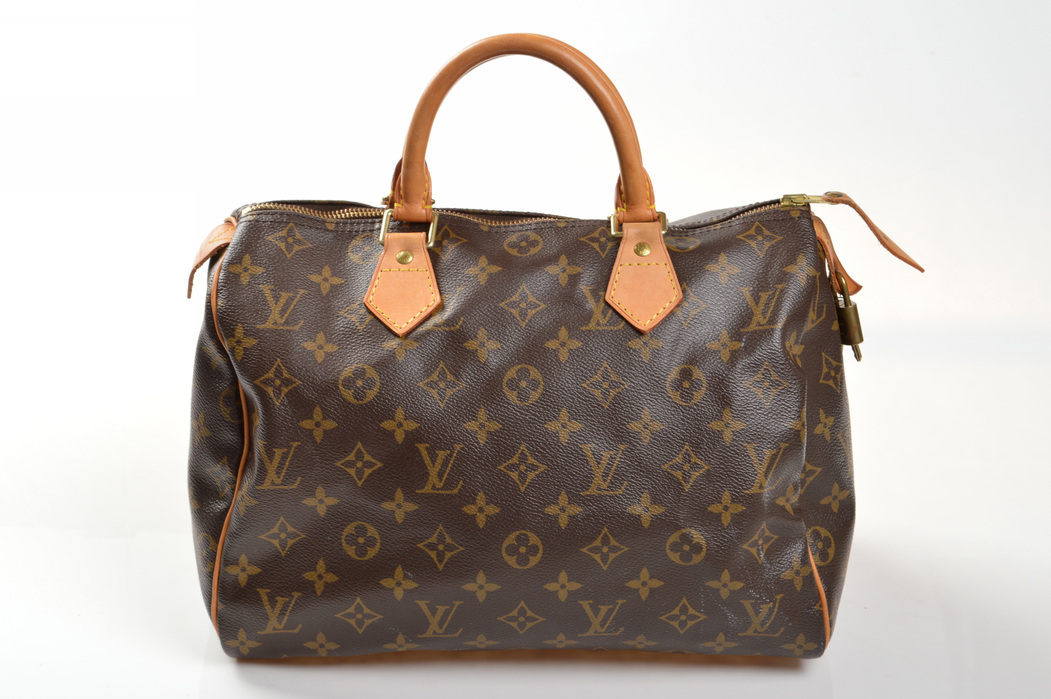 Styled in Monogram canvas with tan leather trim and gold metal hardware, M41524, AA0025, 30 x 25 x 18cm.
