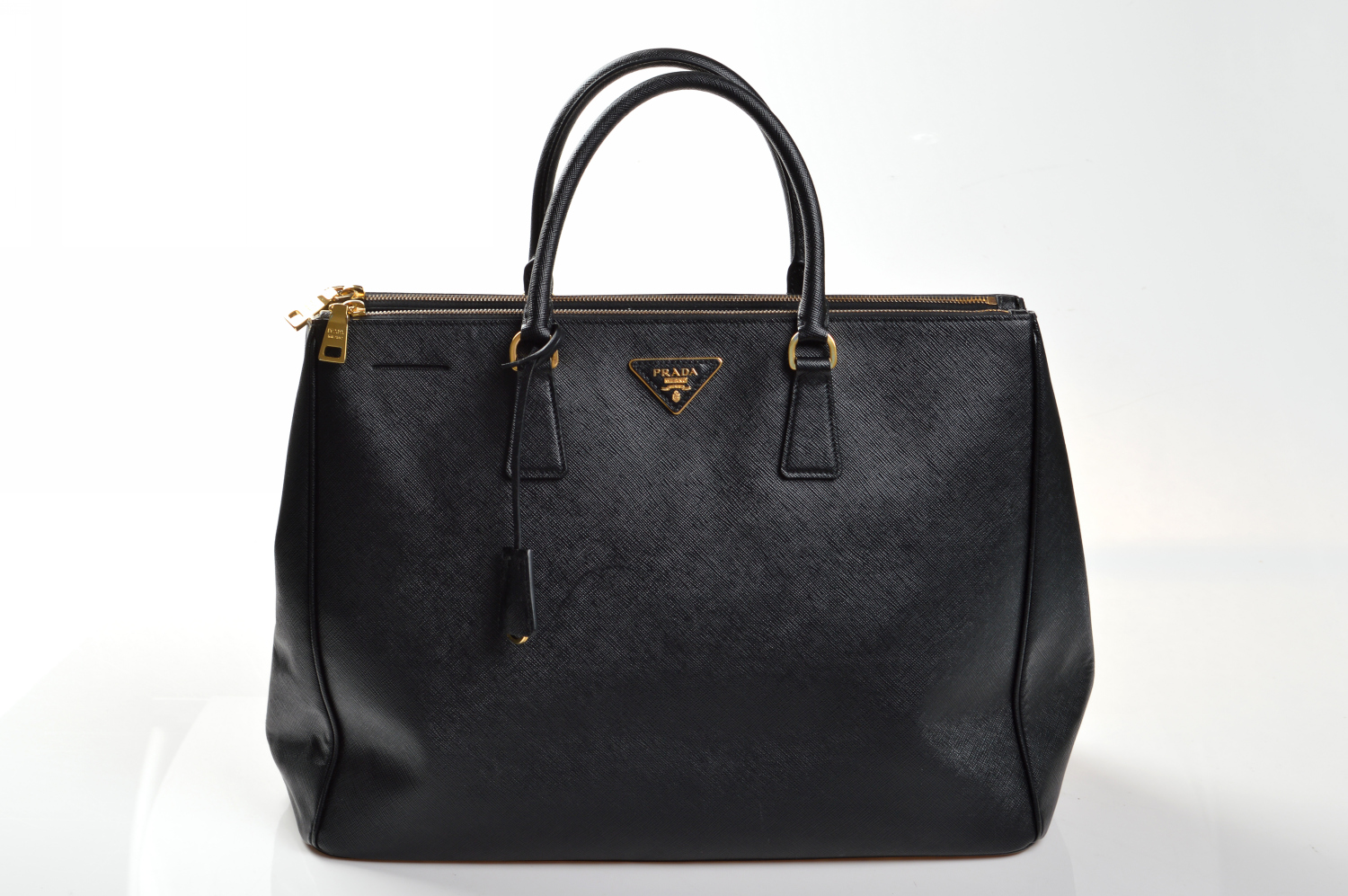 Styled in black leather with black leather handles and gold metal hardware, 40 x 30 x 17cm.