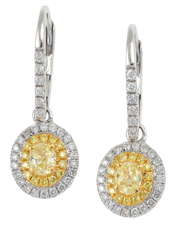Each earring featuring an oval cut yellow diamond of 0.25cts, surrounded by rows of round brilliant cut yellow and white diamonds, mounted in 18ct white gold.