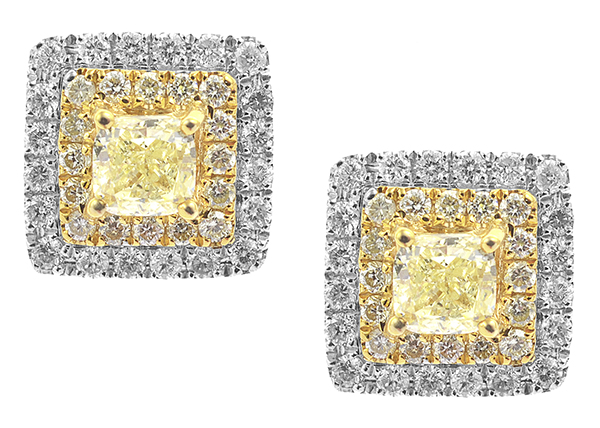 Each earring centrally set with a cushion cut yellow diamond of 0.43cts, surrounded by round brilliant cut yellow and white diamonds, mounted in 18ct white gold.
