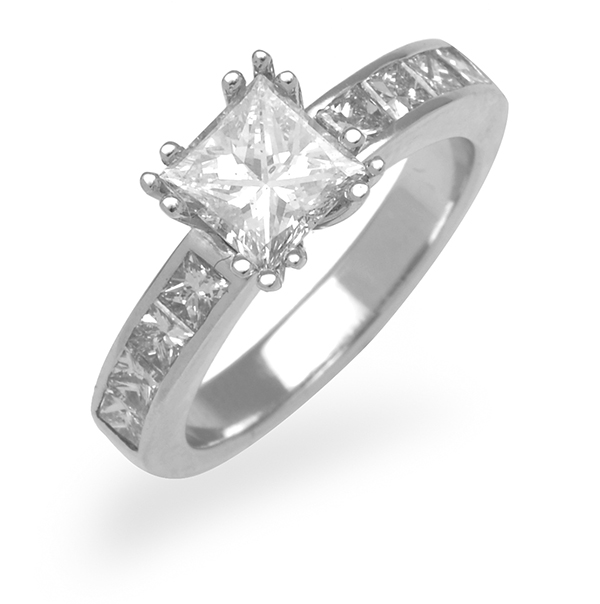 The princess cut diamond of 1.01cts having further diamonds set to the shoulders, mounted in 18ct white gold, ring size L.