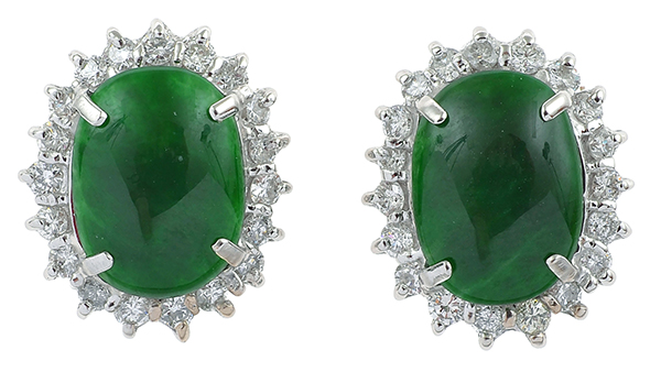 Each set with an oval jadeite cut en cabochon surrounded by round brilliant cut diamonds, mounted in 18ct white gold.