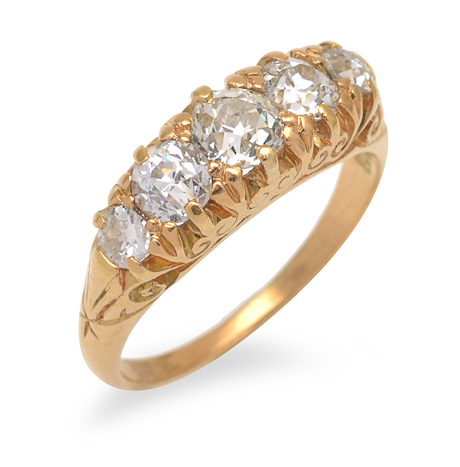 Comprising five graduated old European cut diamonds totalling 1.50cts, mounted in 18ct gold, ring size O.