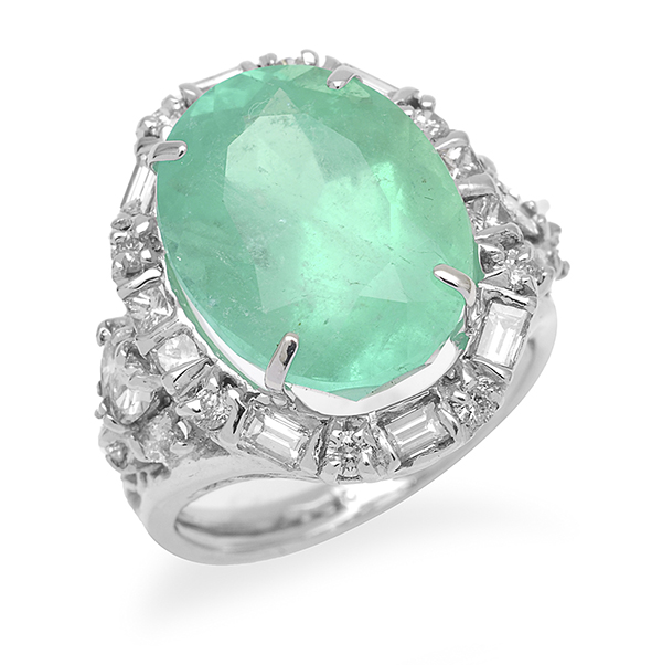 The oval cut emerald of 10.20cts surrounded by round, oval and baguette cut diamonds totaling 1.40cts, mounted in 18ct white gold, ring size M.