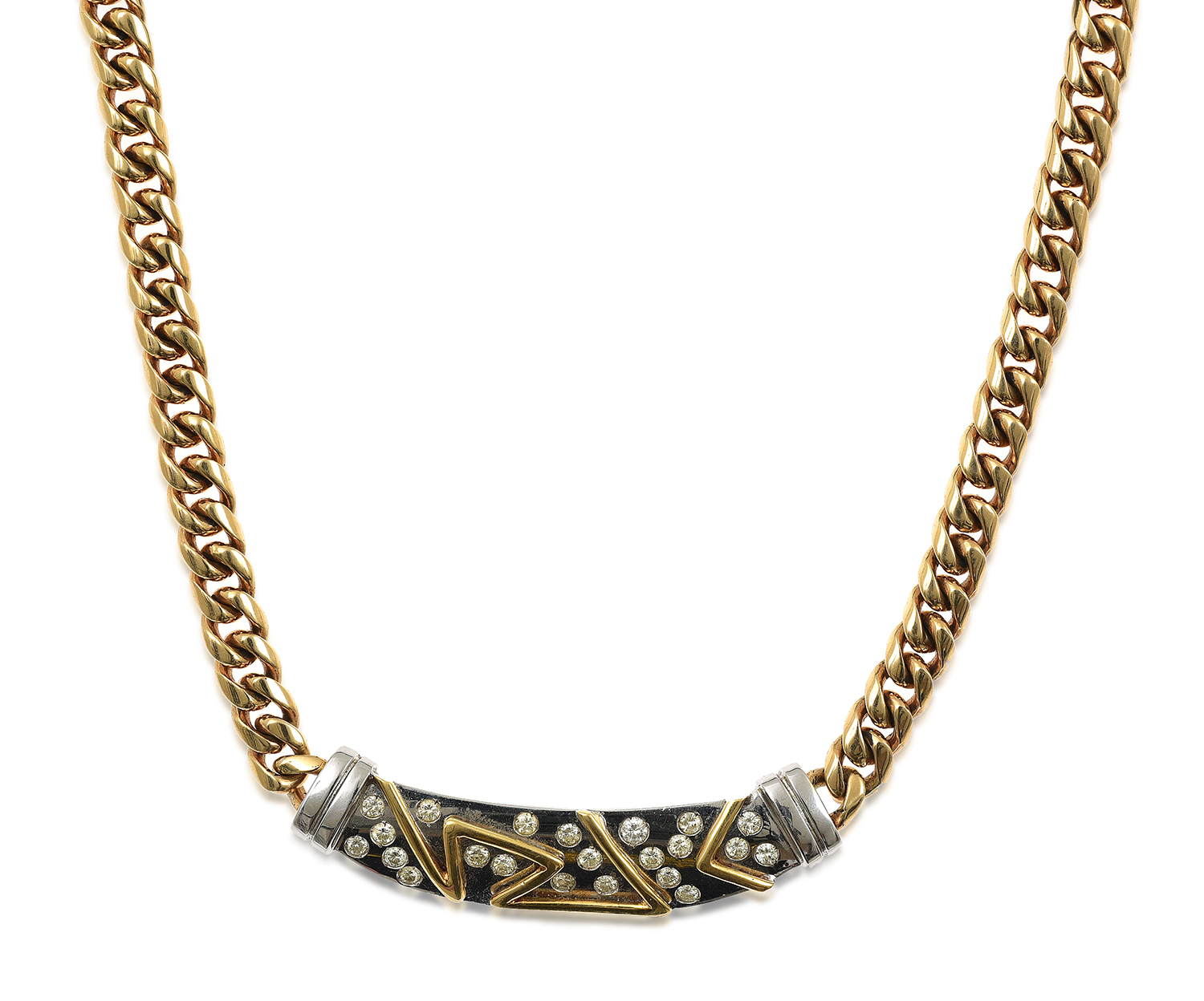 The central motif with geometric detail, highlighted by round brilliant cut diamonds totalling 1.51cts, to a curb link chain, mounted in two tone gold, total length 410mm.