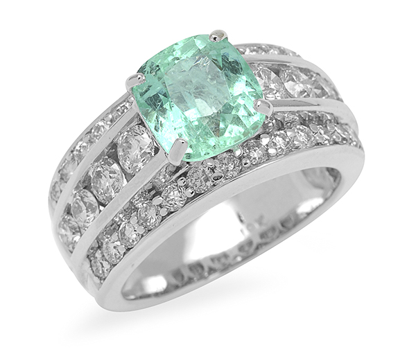 The cushion cut emerald of 2.78cts set above three rows of round brilliant cut diamonds totalling 1.36cts, mounted in 18ct white gold, ring size M.