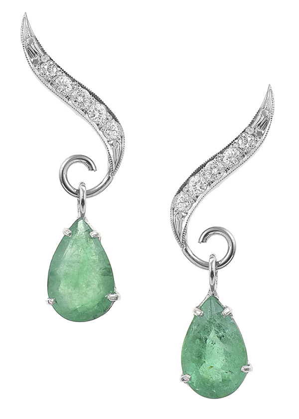 Each earring featuring a detachable pear cut emerald of 6.35cts, suspended from a scroll panel set with round brilliant cut diamonds, mounted in 18ct gold.