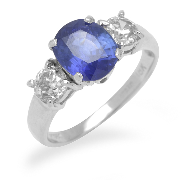 The oval cut sapphire of 2.40cts flanked by two round old brilliant cut diamonds totalling 0.72cts, set in platinum and 18ct white gold, ring size L.