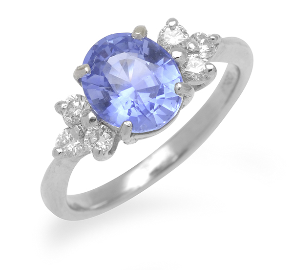 The oval cut sapphire of 2.08cts having a trefoil of round brilliant cut diamonds to each shoulder, mounted in platinum, ring size M.