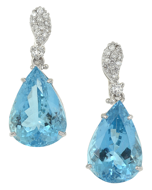 Each earring set with a pear cut aquamarine of 7.70cts surmounted by a panel of round brilliant cut diamonds, in 18ct white gold.