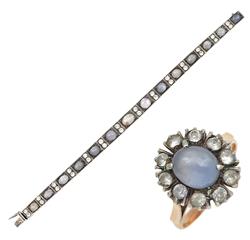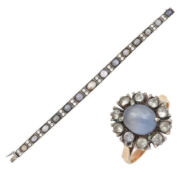 Comprising a bracelet and ring, the bracelet set with fourteen star sapphires cut en cabochon, interspaced with pairs of round brilliant cut white sapphires, the ring of conforming design, all set in white and rose gold, total length 185mm, ring size K.