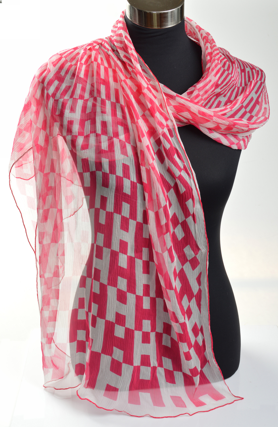 The sheer scarf styled with a repeating 'H' pattern in colours of pink and cream, 170 x 52cm, with box.