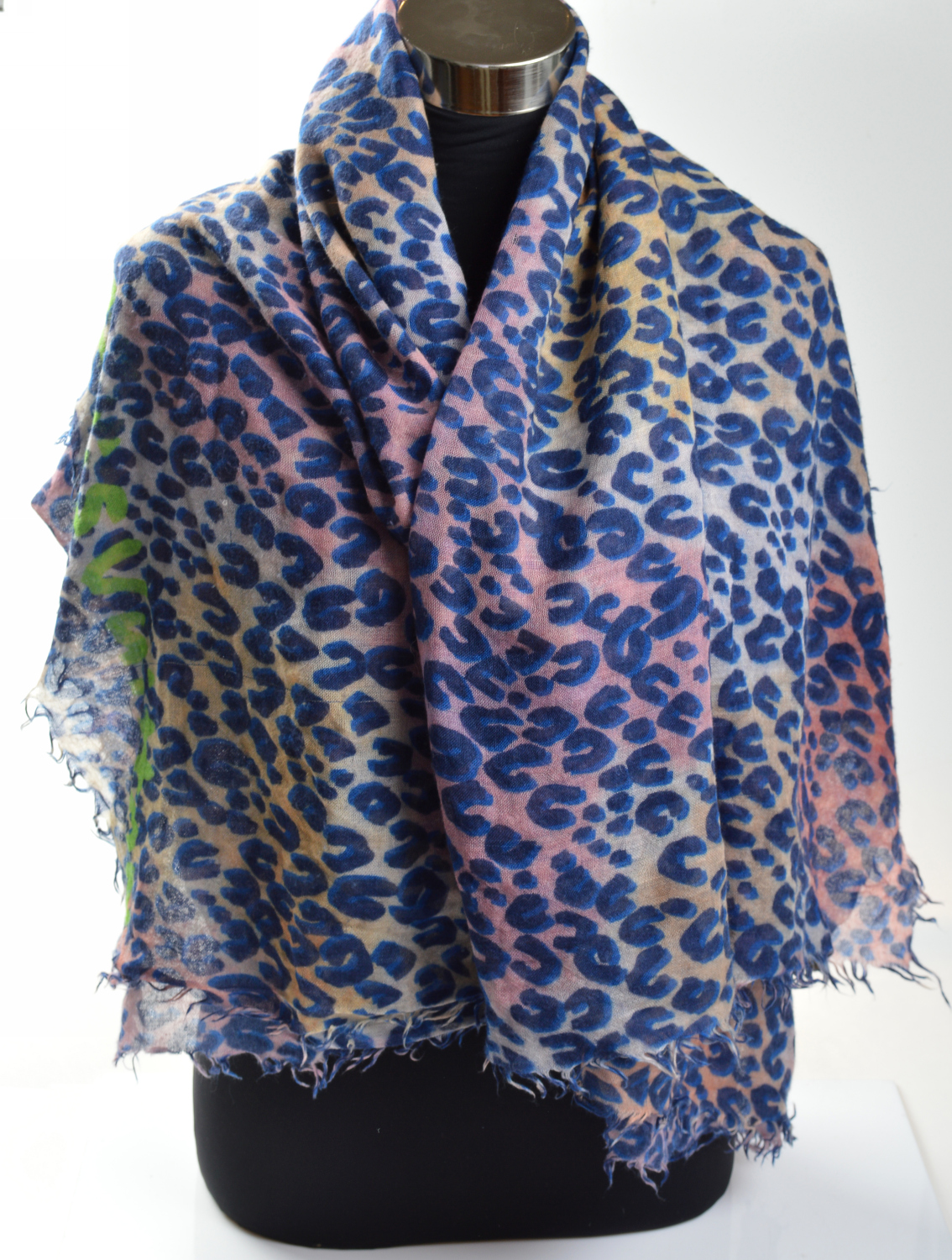 The cashmere and silk shawl styled with a leopard print pattern in tones of blue, with a lime green Louis Vuitton motif, 180 x 130cm.
