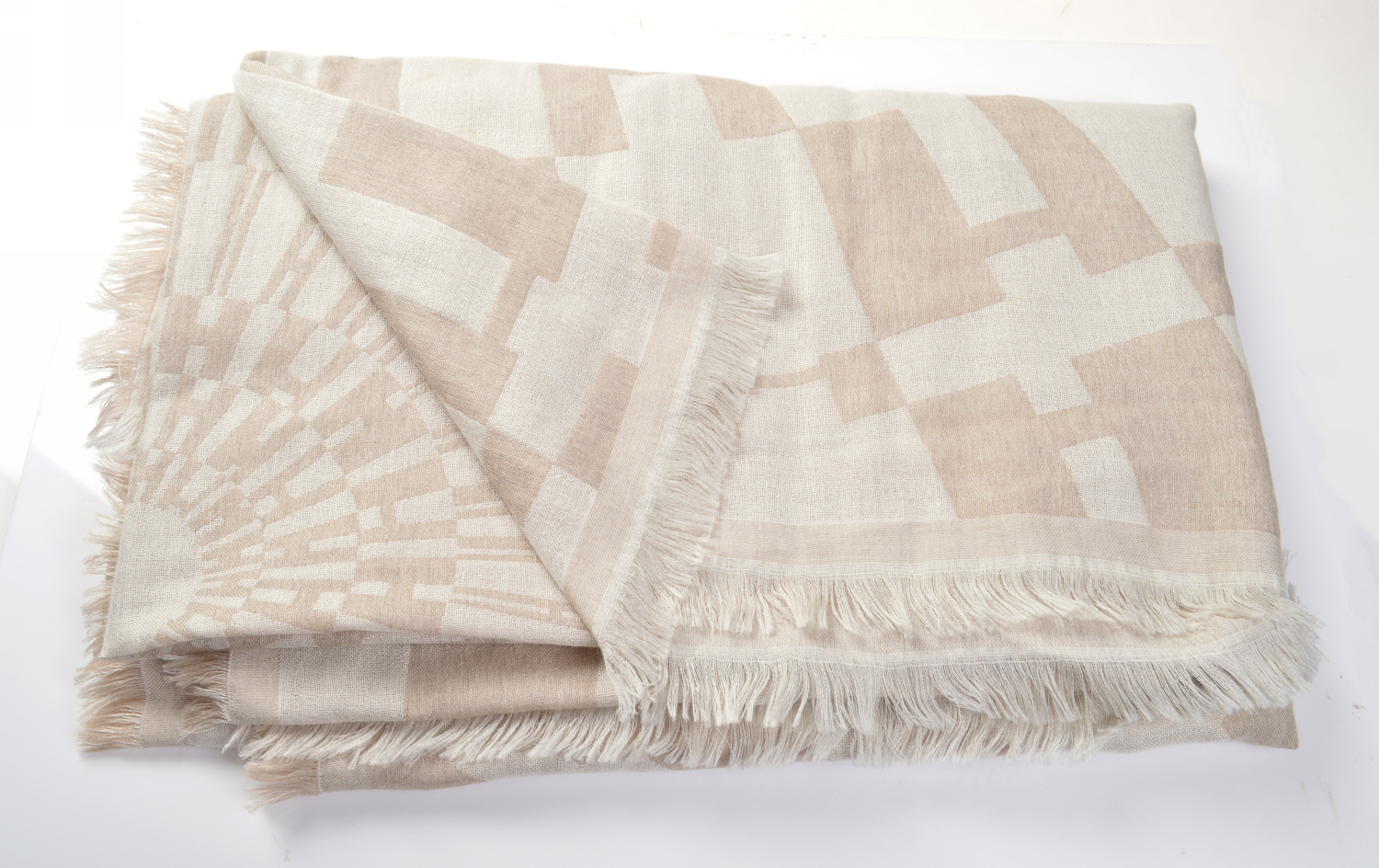 Styled in cream and ivory cashmere and silk, with signature 'H' motif and fringe, 195 x 152cm.