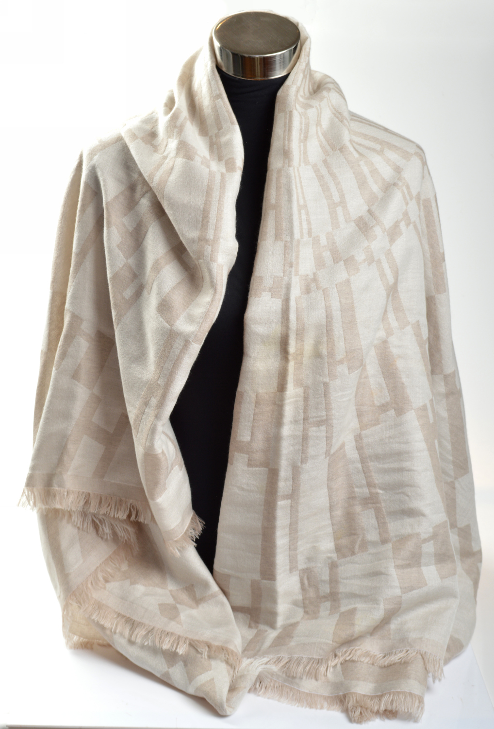 Styled in cream and ivory cashmere and silk, with signature 'H' motif and fringe, 195 x 152cm.