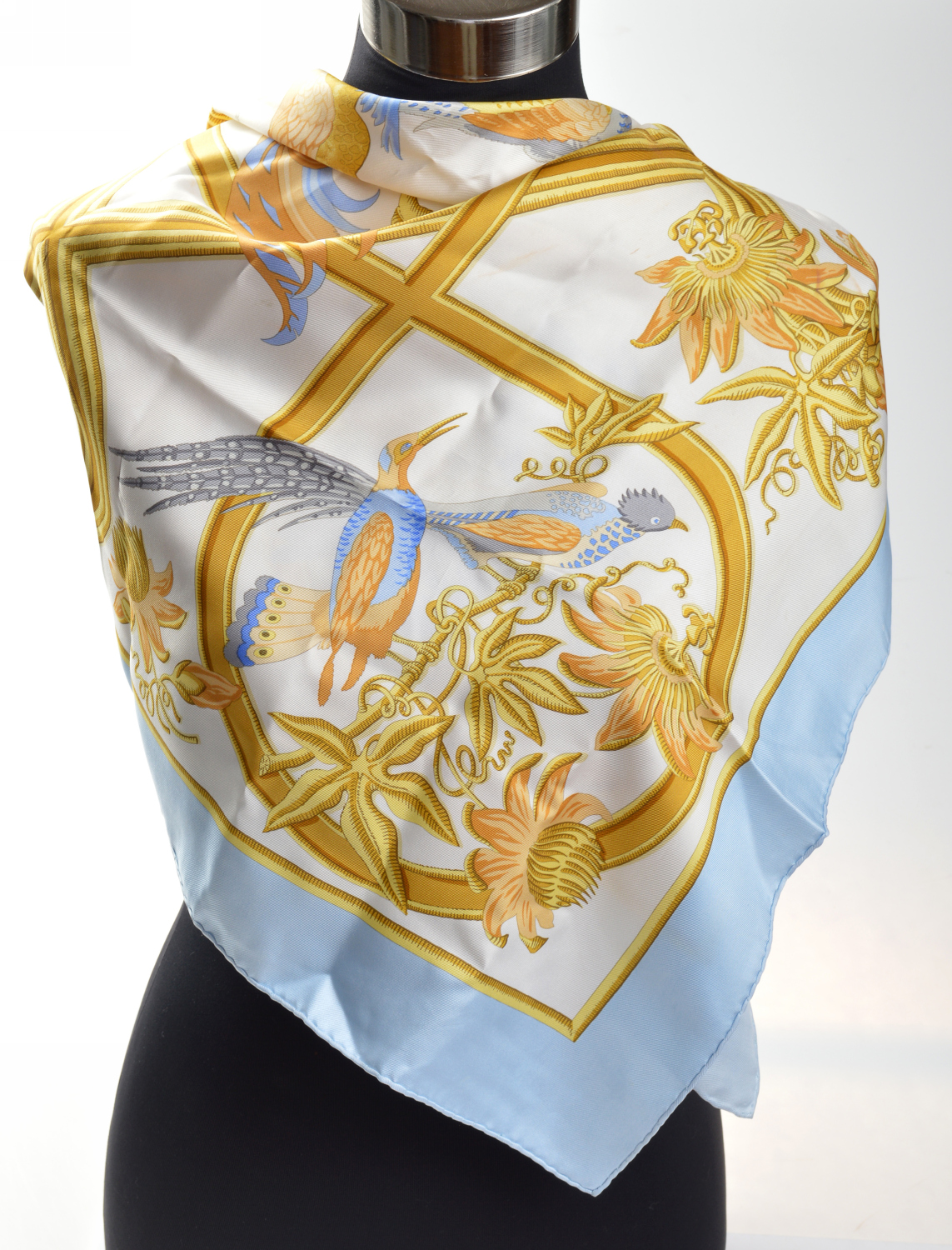 The 'Caraibes' design scarf by Christiane Vauzelle, styled with birds and flora in blue and gold, on a cream background, circa 1975, 89cm square.