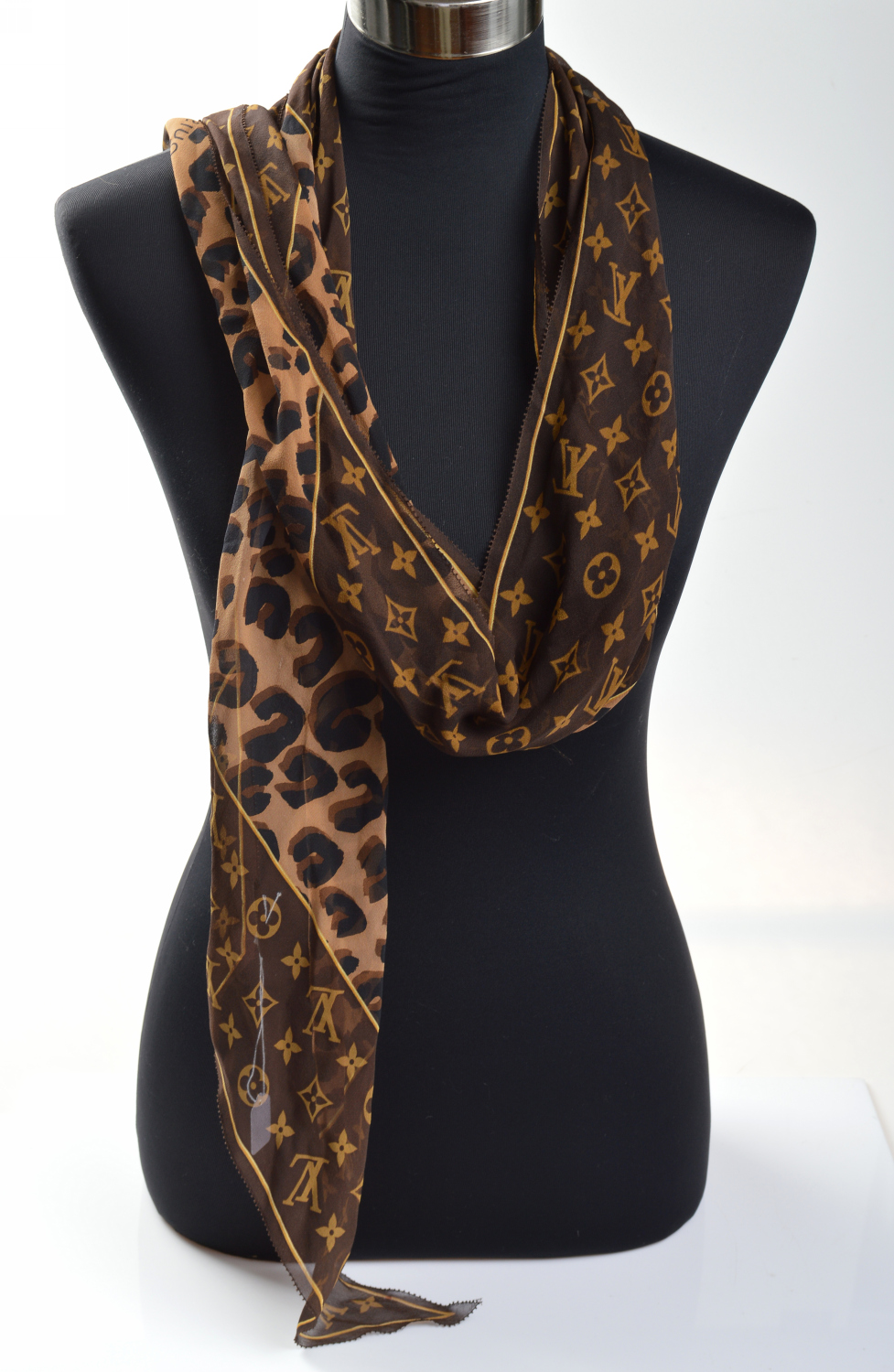 The sheer scarf styled with a Monogram design in tan and brown, 160 x 19cm.
