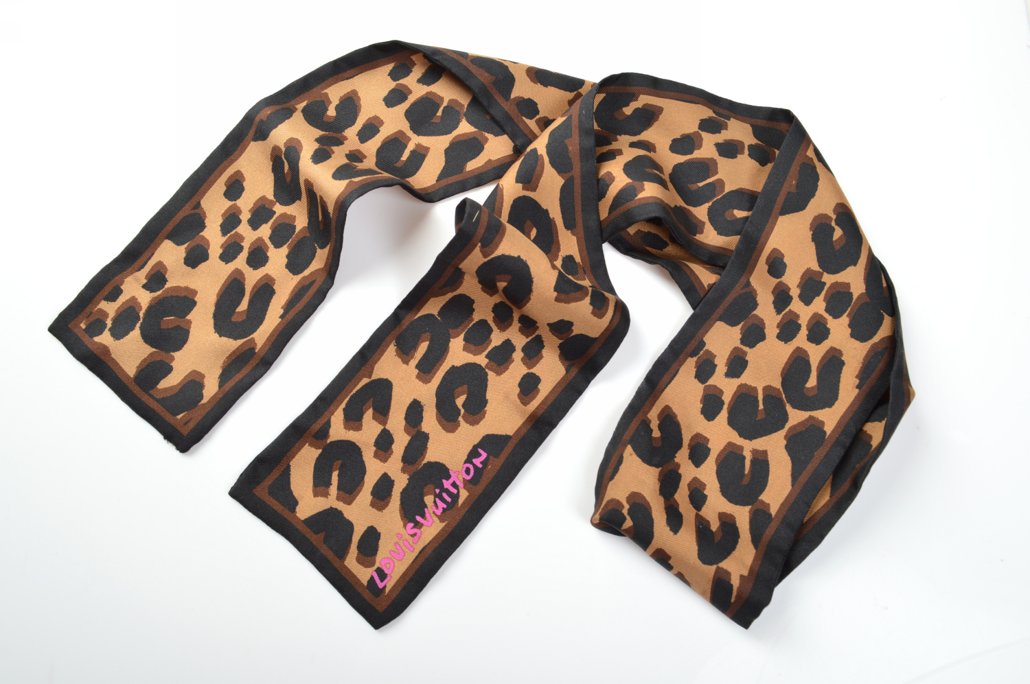 Styled with a leopard print design in brown and black, with a pink Louis Vuitton motif, total length 118cm.