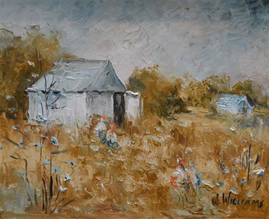 WILMOTTE WILLIAMS, PLAYING IN THE SHED, OIL ON CANVASBOARD, 29.5 X 37CM