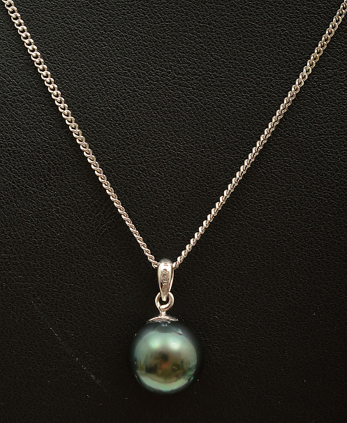 A COOK ISLAND PEARL PENDANT, TO CHAIN STAMPED 9CT WHITE GOLD