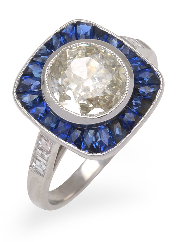 Centrally set with an old style vintage cut diamond of 1.32cts, surrounded by tapered baguette cut sapphires, mounted in platinum, ring size M.