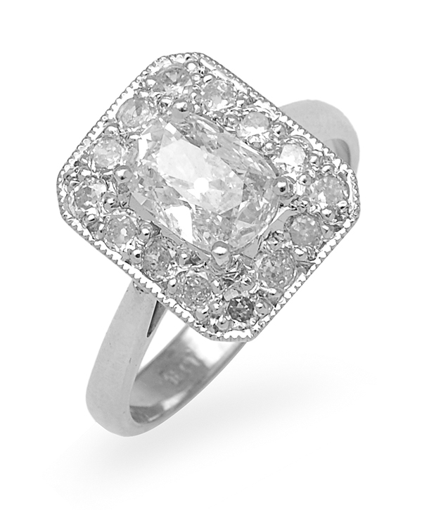 The vintage cushion cut diamond of 0.75cts, surrounded by further diamonds in an octagonal panel, mounted in 18ct white gold, ring size J-K.