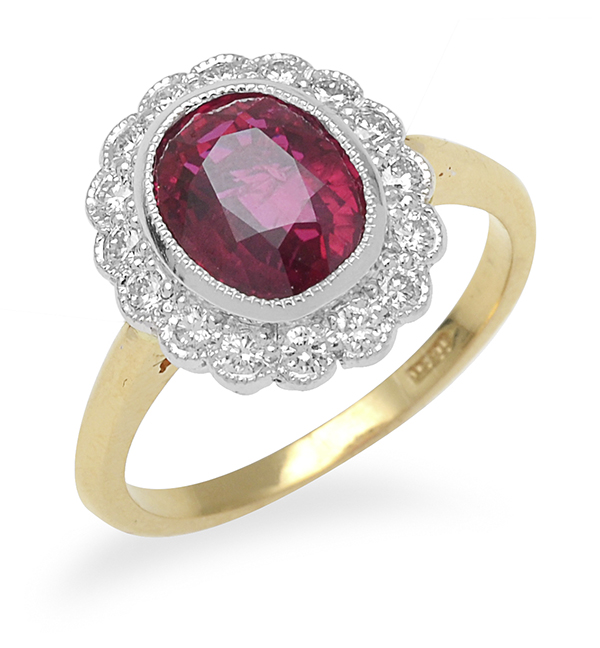 The oval cut ruby of 3.02cts surrounded by sixteen round brilliant cut diamonds totalling 0.35cts, mounted in 18ct gold, ring size L.