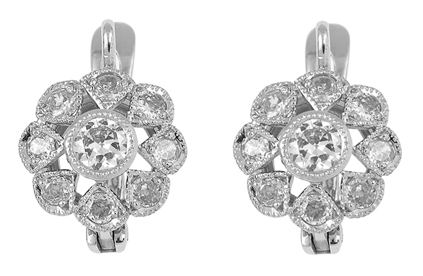 Each centrally set with an old style vintage cut diamond of 0.24cts, surrounded by eight further diamonds in a pierced frame of 18ct white gold.