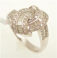 A DIAMOND SET DRESS RING WITH BAGUETTE CUT AND ROUND BRILLIANT CUT DIAMONDS IN 18CT WHITE GOLD