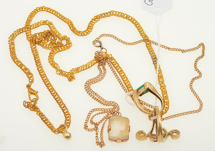 A COLLECTION OF JEWELLERY INCLUDING TWO GEM SET RINGS, A DIAMOND SOLITAIRE PENDANT AND A CAMEO PENDANT IN GOLD, TO GOLD PLATED CHAINS
