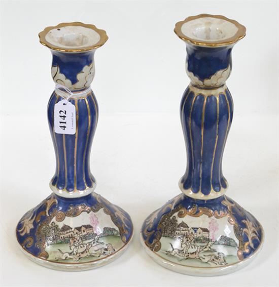 A PAIR OF EXPORTWARE CANDLESTICKS IN POWDER BLUE TONES