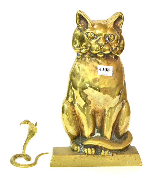 A BRASS DOOR STOP SHAPED LIKE A CAT AND A BRASS SNAKE