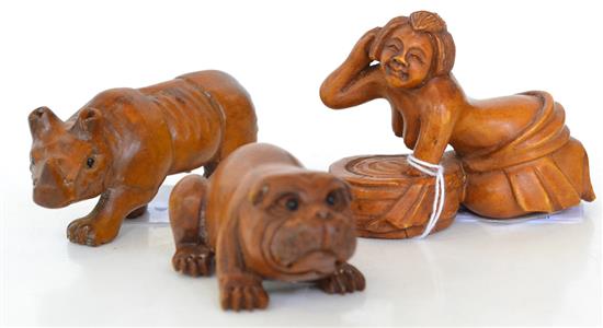 THREE 20TH CENTURY NETSUKE'S, INCL. BULLDOG, BATHING LADY AND RHINO