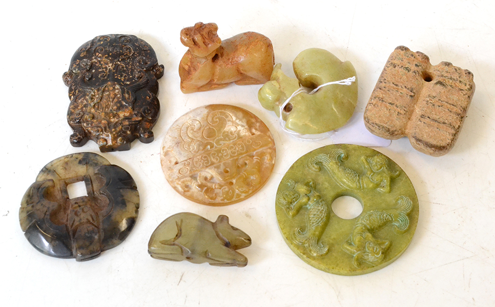 COLLECTION OF JADE AND STONE ITEMS, INCL. DISCS, PENDANTS ETC