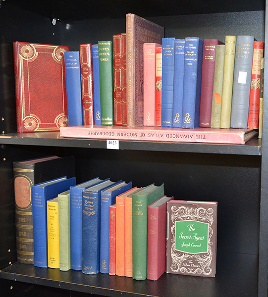 TWO SHELVES OF ASSORTED VINTAGE HARDBACKS, INCL. LITERATURE, MAP, ETC