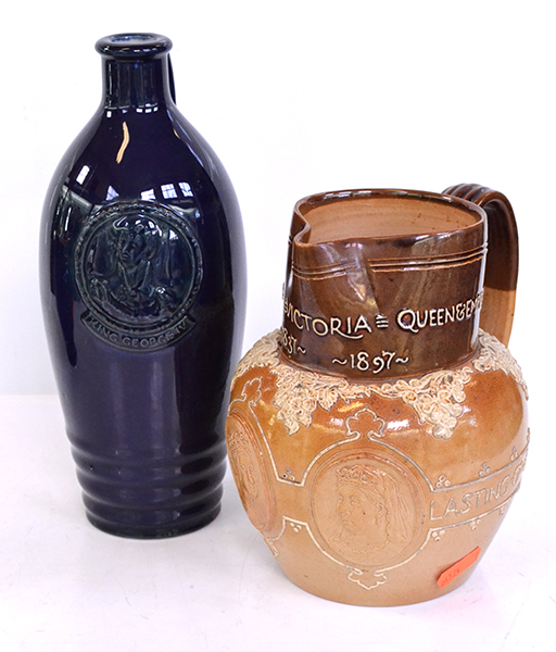 A COMMEMORATIVE LAMBETH WARE JUG 'VICTORIA AND QUEEN EMPRESS AND ANOTHER DOULTON DECANTER