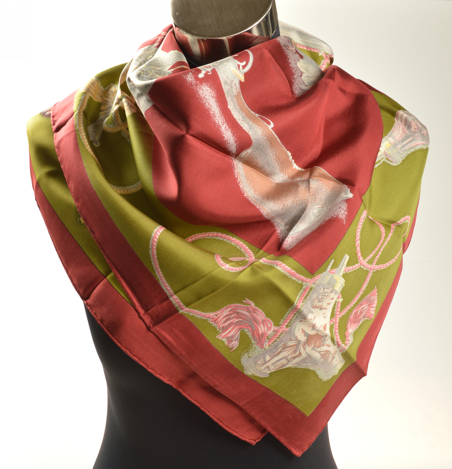 The 'Les Fusils' design by Henri de Linares, in colours of burgundy and olive green, first issued in 1960, labelled 'Franz Sauer, Koln', 89cm square, with original Hermes envelope.