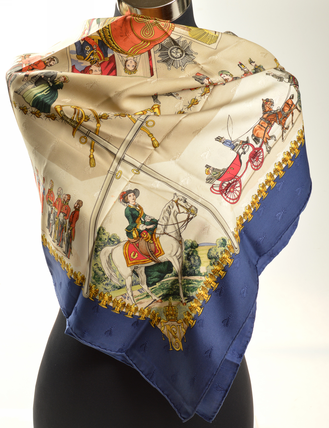 The 'L'Empire C'est La Paix' design by Philippe Ledoux, with Napoleonic bee detail, in multi colours on a cream and navy background, first issued in 1970, labelled 'Franz Sauer, Koln', 89cm square, with original Hermes envelope, as found.