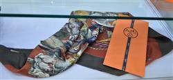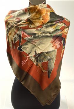 The 'Gibiers' design by Henri de Linares, in autumnal colours, with a brown border, first issued 1966, labelled 'Franz Sauer, Koln', 89cm square, with original Hermes envelope, as found.