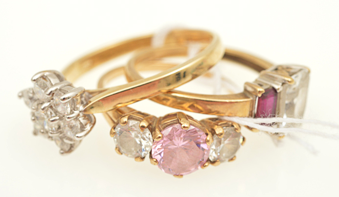 A COLLECTION OF THREE CUBIC ZIRCONIA DRESS RINGS, IN 9CT GOLD