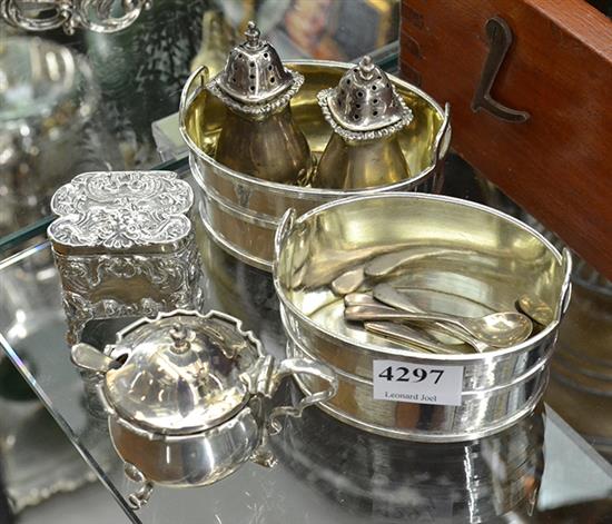 A COLLECTION OF STERLING SILVER INCL. SALT SPOONS, CRUETS, JEWELLERY BOX, ETC.