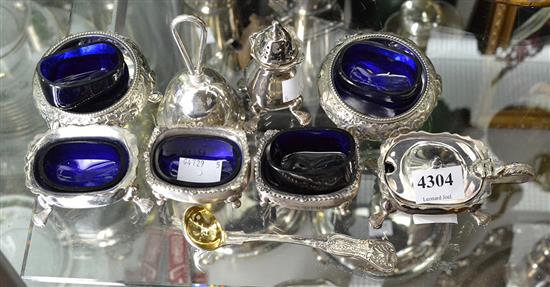A COLLECTION OF SILVER PLATE AND STERLING SILVER ITEMS, INCL. SALT DISHES, CRUETS ETC