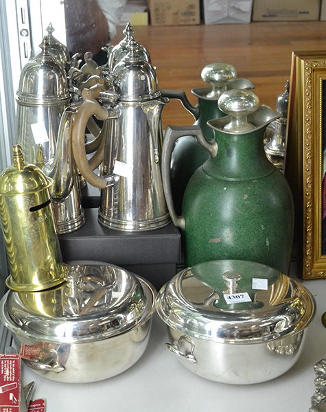 A COLLECTION OF SILVER PLATE INCL. COFFEE POTS, TUREEN, BAKELITE JUG