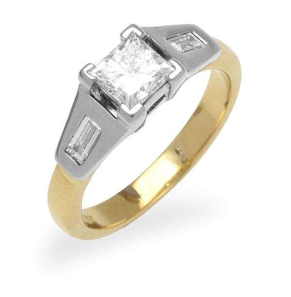 The princess cut diamond of 0.70cts flanked by baguette cut diamonds, mounted in 18ct white and yellow gold, ring size O.